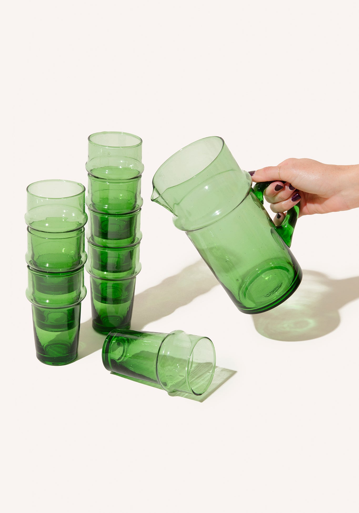 Due to the handmade nature of our products, each is a work of art; a one-of-a-kind piece with slight variations in color, texture and shape. Our glassware is hand blown in Marrakesh and made of recycled glass. Sustainability never looked so good.